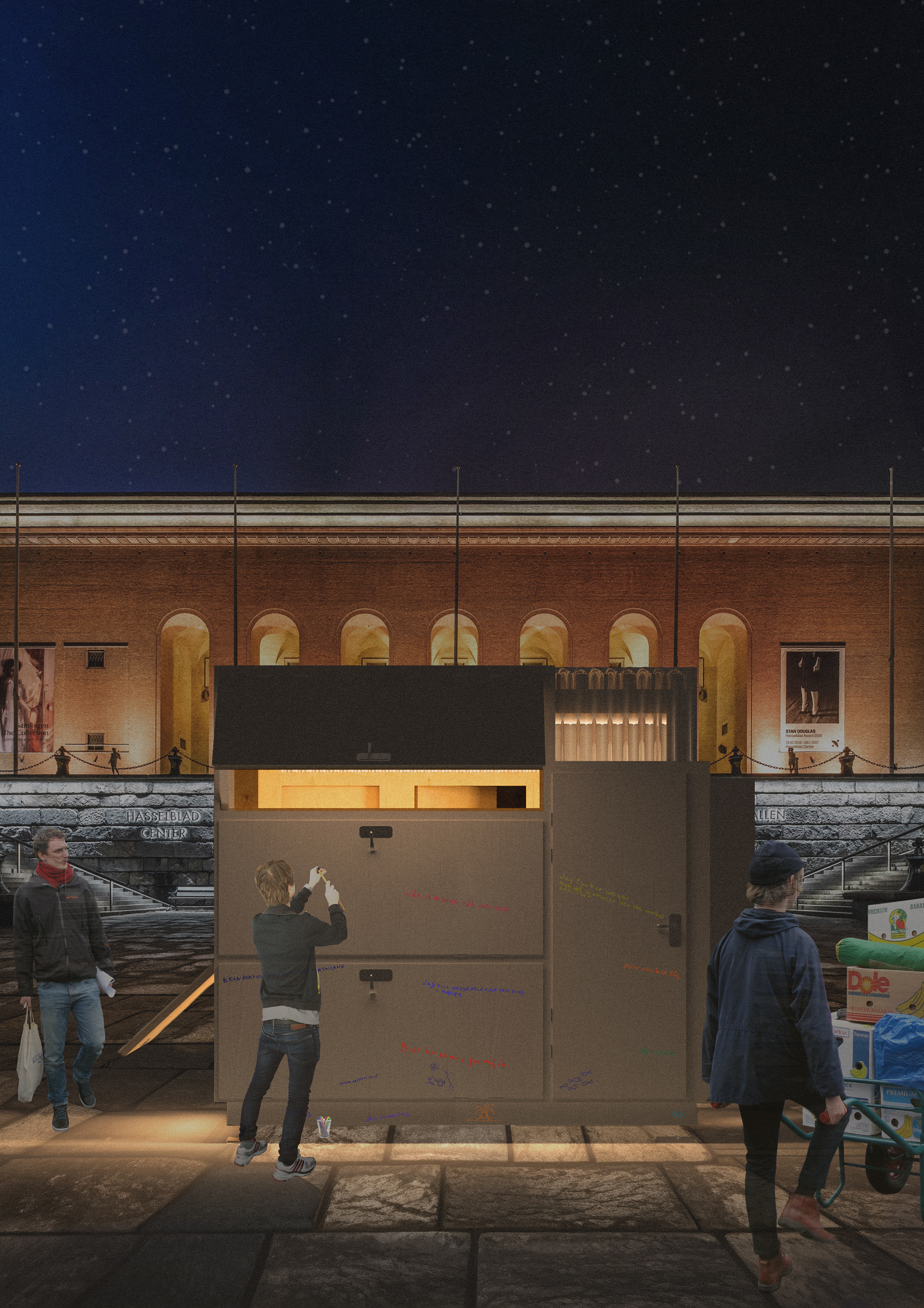 The structure is easily assembled and withstands all weather due to its rigid form, as a consequence the pavilion will be heavy and therefore need truck transportation. All doors will be lockable creating flexible storage for all needs and purposes. After disassembly, the doors still function as doors but can also be considered artworks, arguably adding value to an already reused building element.