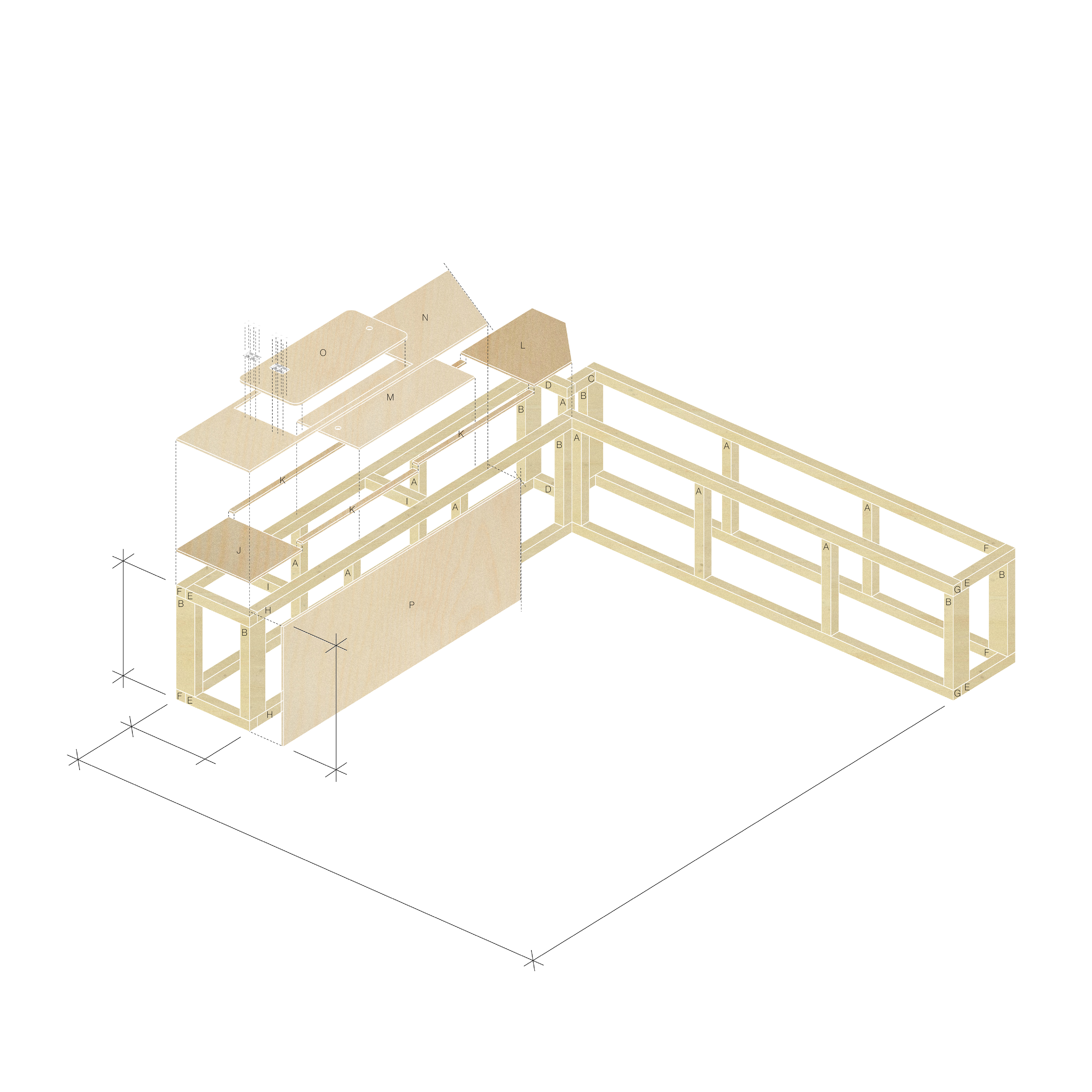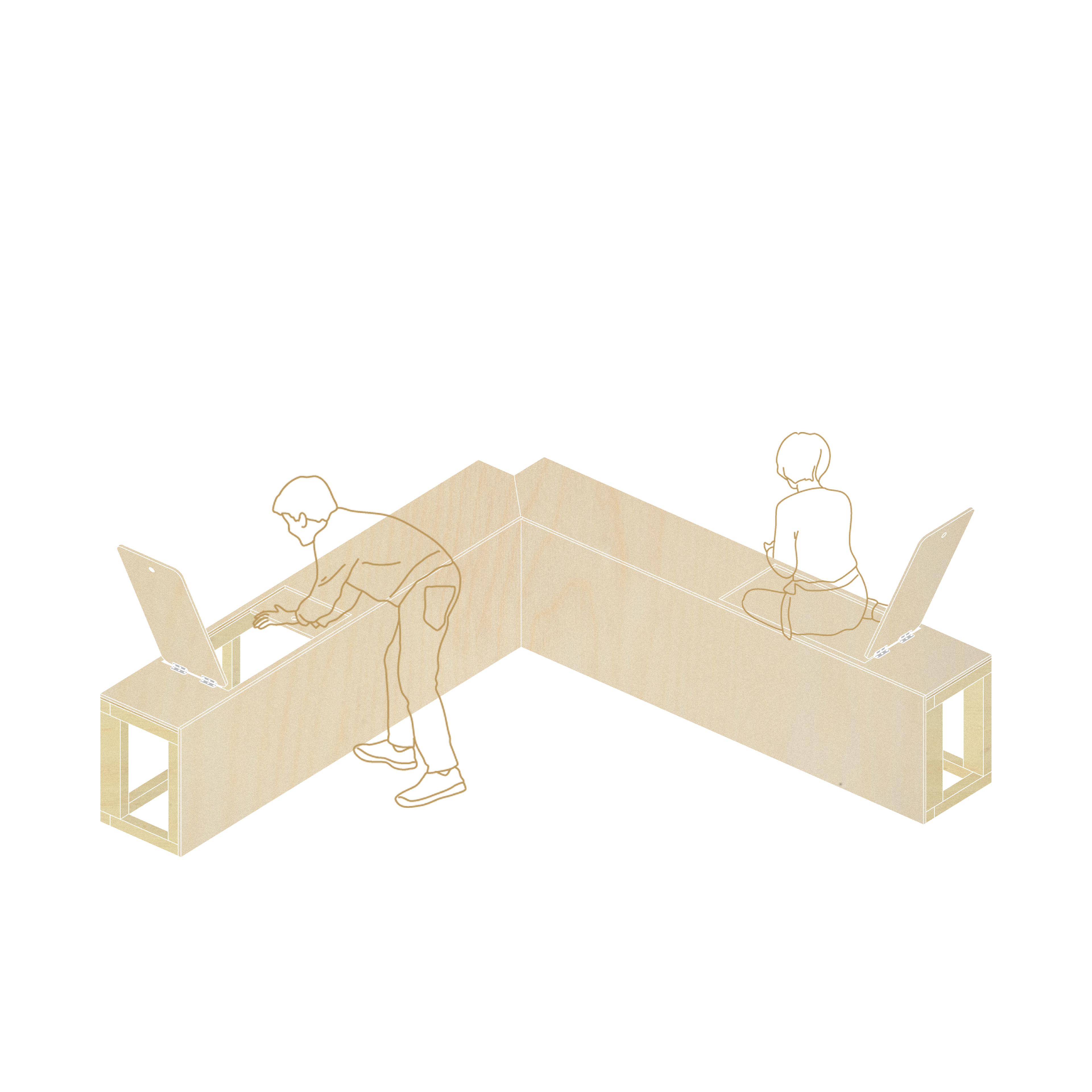 Site-built benches with integrated seating for Skicabin. Developed a grasshopper tool that inputs a reference footprint curve and generates structurally logical wooden frames and plywood sheets. A hatch is added to the uppermost layers intended to be used as a cover for the storage compartment and as a backrest for seating.
